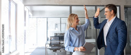 Happy smiling successful Hispanic businessman and young European professional business woman celebrating achieving performance, outcomes in work giving high five standing in office. Banner, copy space