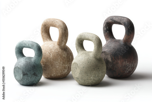 Kettlebells in various colors and sizes, showcasing unique textures and shapes, perfect for fitness enthusiasts