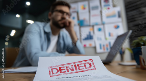 Stack of paperwork labeled DENIED in focus with businesswoman using phone and laptop in background.