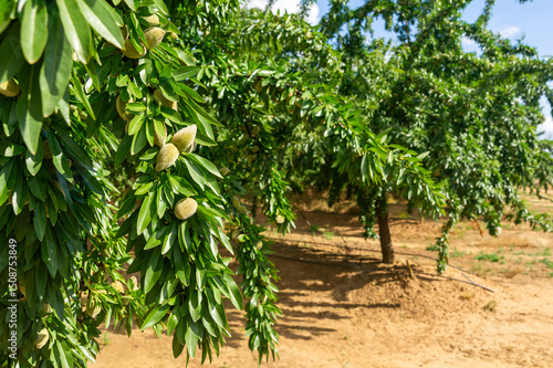 Almond Branch with Young Fruits: Row of Almond Trees with Drip Irrigation in Background.