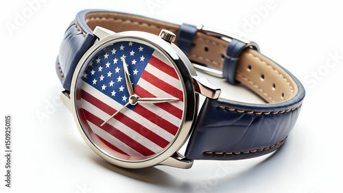 Patriotic Wristwatch American Flag Design on Leather Strap on white background