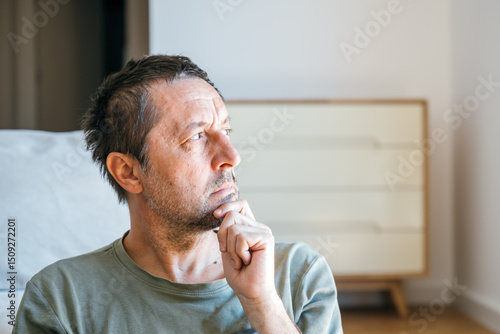 Portrait of pensive man sitting in living room in morning, thinking and looking out the window