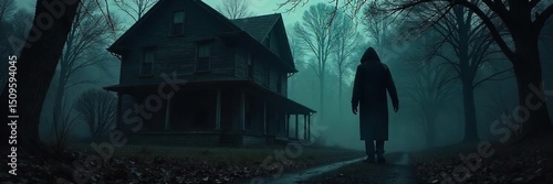 A shadowy figure lurking in a dark, dilapidated house, its presence felt more than seen; a chilling atmosphere of suspense and dread pervades the scene , mystery, gothic