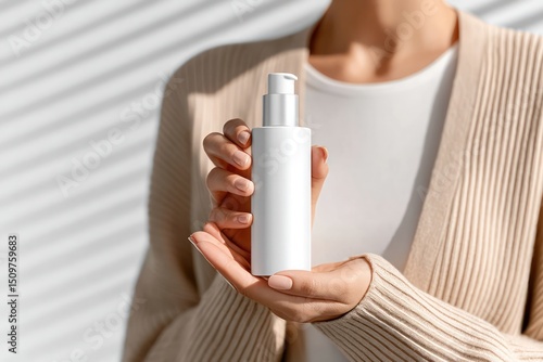 A woman is holding a bottle of lotion in her hand. The bottle is white and has a pump on top. The scene is set in a room with a window