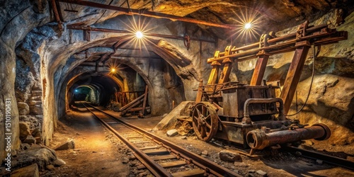 Abandoned mine shaft with old machinery and rusty metal beams exposed in a dimly lit tunnel