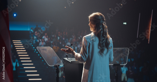 Female Political Party Representative Speaking at a Press Conference in Government Building. Press Officer Delivering a Speech at a Summit. Minister Talking at Congress. Stage with American Flags