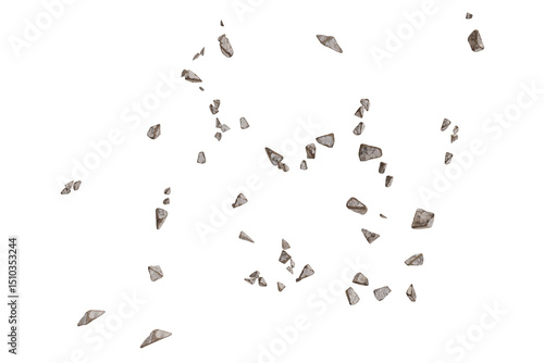 Scattered, irregular grey fragments against a black background, possibly small stones or broken pieces of something