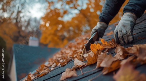 Close-up of a man cleaning the roof with leaves and gloves, a fall season house washing work concept, outdoors in the backyard on an autumn day.