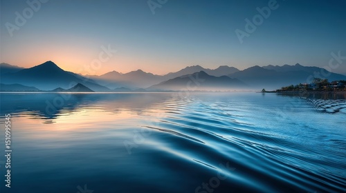 A photo shows a body of water with a mountain backdrop and a tiny town on the shoreline in the foreground