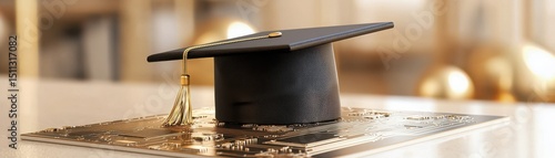 Graduation Cap on Circuit Board Symbolizing Technology and Education