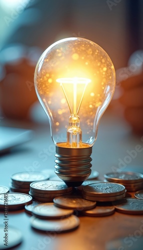 Bright light bulb, coins. Illustrates idea, innovation, investment. Business concept, finance, savings, wealth, opportunity, money, success. Creative thinking, financial growth.