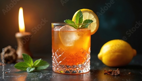 Stinger cocktail with lemon slice mint garnish in a glass. Ice cubes with fresh citrus and bar ingredients with burning candle in background. Refreshing alcoholic drink for party bar menu.