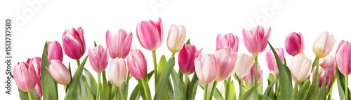 A group of pink and white tulips with green stems against a black background in a horizontal row