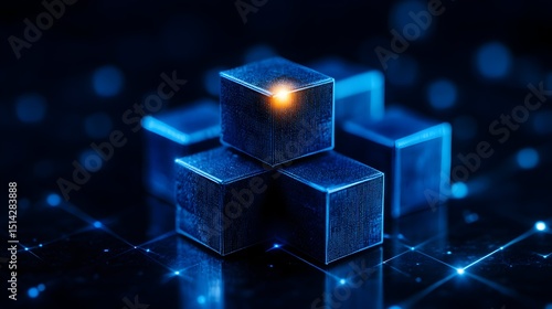 Glowing central cube atop a cluster of dark, metallic cubes, set against a dark, gridded background with subtle light trails