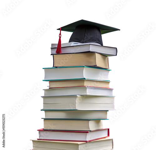 A stack of books with a graduation cap on top against a black background in a vertical shot