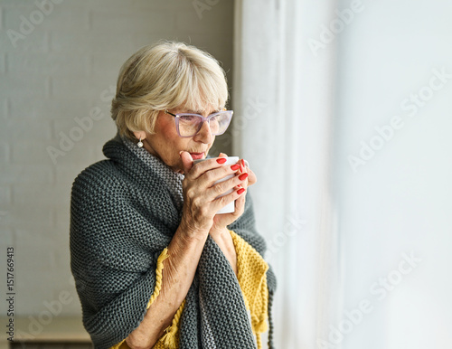Portrait of a senior elderly woman havin a flu or virus, being sick and drinking a hot drink tea