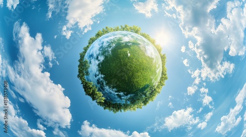 simple green tiny planet without buildings in blue sky with beautiful clouds. Transformation of spherical panorama 360 degrees. Spherical abstract aerial view. Curvature of space.