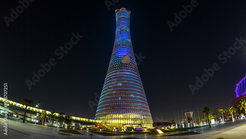 The Aspire Tower or Torch Hotel timelapse in Doha Sports City at night. Doha, Qatar, Middle East