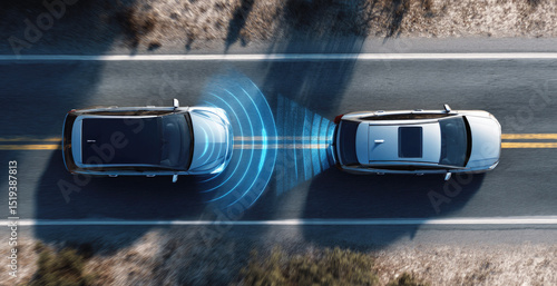Top view of two cars using advanced driver-assistance system with radar detection on a road, visualizing autonomous vehicle technology and safe driving distance.