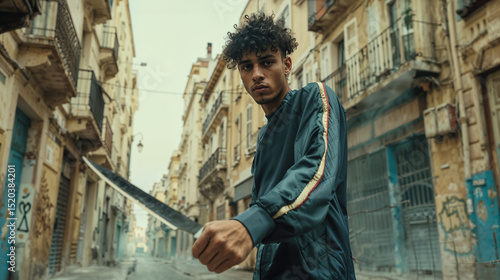 Young delinquency in European neighborhoods due to immigration. A young North African male teenager from Morocco or Algeria, carrying a knife and wearing a tracksuit, with threatening attitude