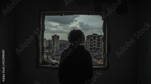 Moody photo of a figure with curly hair in a dark hoodie, standing in a ruined room, gazing through a broken window at a crumbling city. Overcast sky casts a gray, somber light.