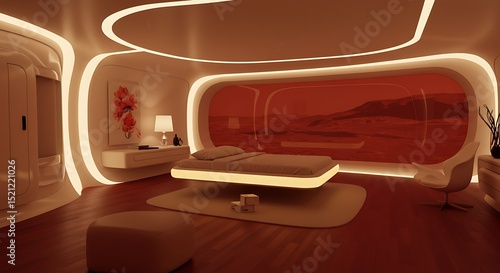Futuristic Martian bedroom with low-gravity bed, ambient lighting, and curved architecture