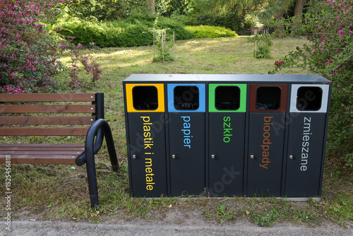 Kolorowe pojemniki do selektywnej selekcji odpadów, ekologia, segregacja śmieci.