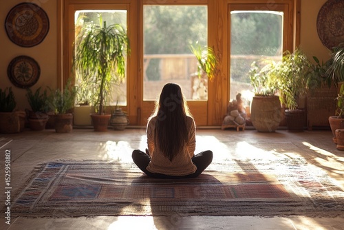 Exercise mat on floor with woman doing yoga, practicing mindfulness and flexibility in a calm and serene environment, Generative AI
