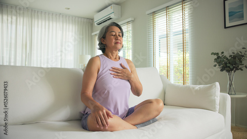 Asia adult aged people middle age mindful happy old woman reduce hot flash sit at home sofa yoga zen calm stress relief deep meditate self love relax elder aging life asian female mental health care.