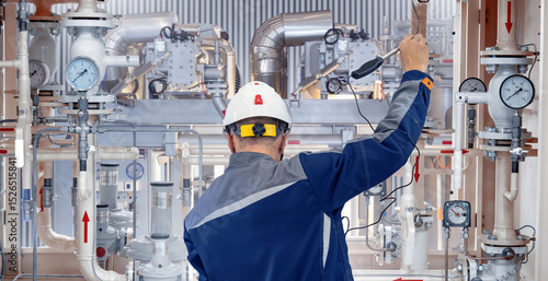 #629382444Professional female worker operating heavy machinery. Concept of women in industry, equality.