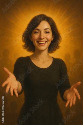 Uśmiechnięta kobieta z otwartymi ramionami i promieniami światła – symbol serdeczności, otwartości i pozytywnej energii w relacjach