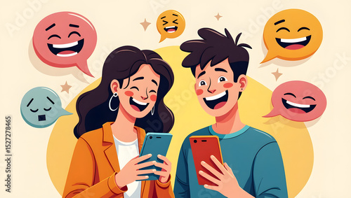 Flat vector of two friends sharing memes and emojis online. A fun and lighthearted way to maintain connection and laughter in digital friendships.
