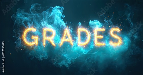 Bright word grades glows with orange light. Blue smoke swirls around lettering, creating dramatic effect. Dark background enhances visual impact.