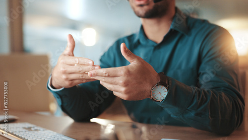 Hands, man and explain on computer for video call, assistance and advice for customer service. Agent, talking and helping client with online procedure, solution steps and information at call centre
