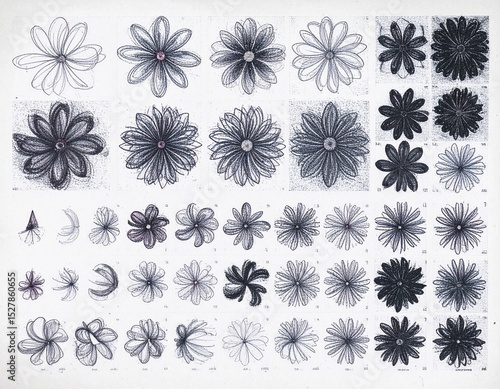 Zestaw czarno-białych motywów kwiatowych, bazgroły, mozaika