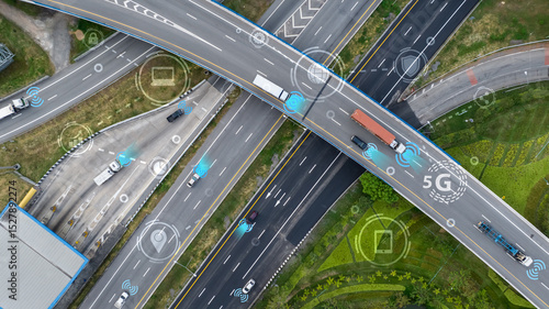 Aerial view of modern highway interchange with autonomous vehicles and connectivity symbols. Smart traffic systems and 5G technology for future transportation and intelligent mobility solutions.