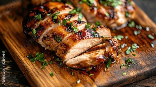 Succulent grilled chicken breast slices are artfully arranged on a rustic wooden cutting board, showcasing culinary artistry and mouthwatering flavors for food lovers.