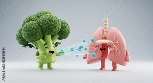 A lively broccoli character emitting beneficial rays towards a smiling pair of human lungs, with blue energy particles floating around, illustrating the positive impact of broccoli on respiratory heal