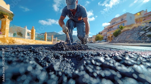 A laborer works diligently on the roadway, symbolizing hard work and dedication in construction, as they contribute to community infrastructure and progress.