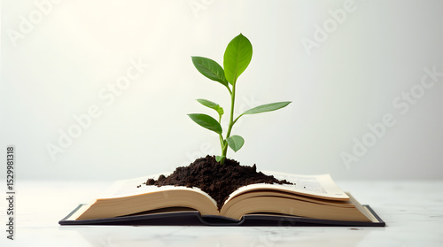 livre ouvert ou pousse une plante verte. isolé sur fond blanc, style photoréaliste, symbole du savoir