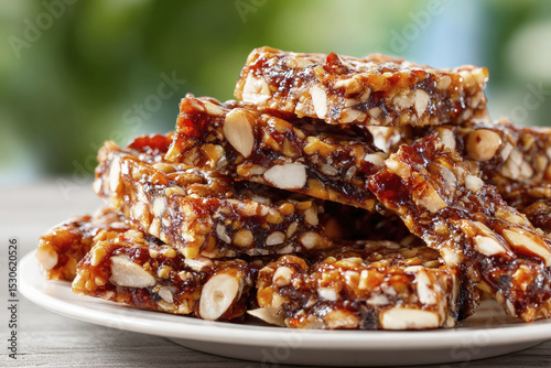 Close-up of nut and dried fruit brittle bars stacked on a white plate, glistening with caramelized syrup, against a blurred green background.