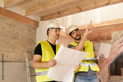 Two Male construction workers in safety gear discussing the building plans inside the building site