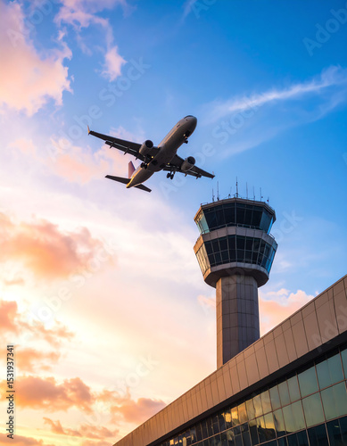 An airplane flies over an airport control tower at sunset, with vibrant clouds and a clear sky in the background