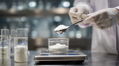 粉末を計量する日本人女性作業員の手元構図