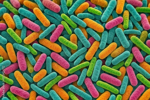 Microscopic view of beneficial probiotic bacteria colonies forming intricate patterns in gut microbiome environment