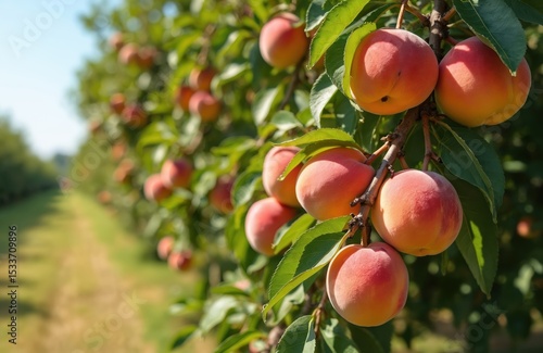 Sunlit orchard showcases ripe peaches on tree branches. Fresh juicy fruits are ready for harvest. Healthy organic food, farming, agriculture, natural fruits in sunlight.