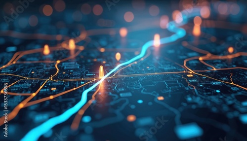 Digital illustration delivery route optimization concept. Visualization features interconnected data streams representing logistics, faster efficient shipment process, tracking, management, platform,
