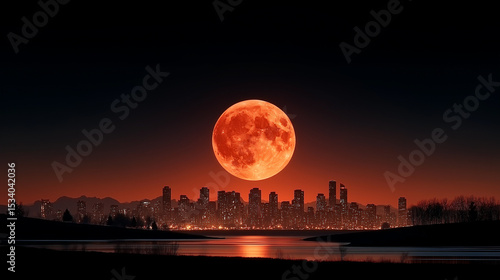 Crimson Lunar Eclipse over Metropolis: A breathtaking cityscape silhouette is framed by a large, vibrant crimson moon, illuminating the tranquil waters below, casting a mesmerizing spectacle.
