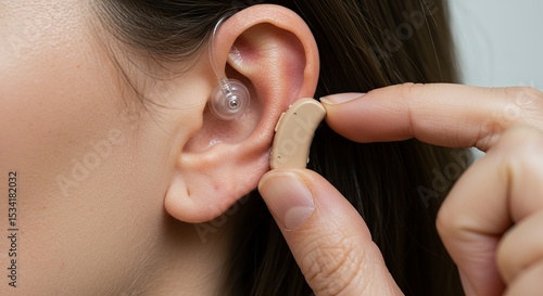 Close-up of a woman's ear with an in-the-ear hearing aid being inserted. Fingers are holding the device.