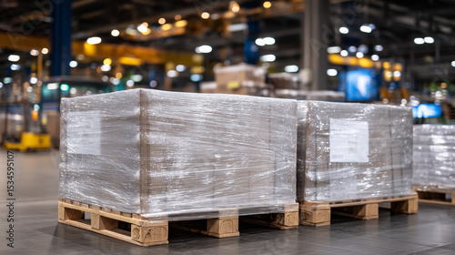 Pallets wrapped in plastic shrink film ready for shipment, stacked neatly on warehouse floor under LED lights